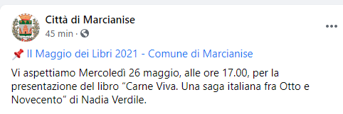 Questa parte del post pubblicato sulla pagina Facebook 'Città di Marcianise': "Il Maggio dei libri - Comune di Marcianise. Vi aspettiamo - si legge nel post - Mercoledì 26 maggio, alle ore 17.00, per la presentazione del libro “Carne Viva. Una saga italiana - si legge ancora - fra Otto e Novecento” di Nadia Verdile (...)".