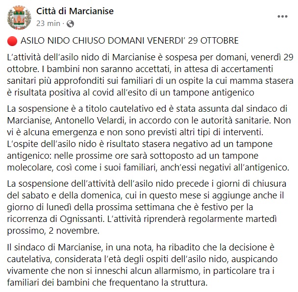 Questo quanto apprendiamo dalla pagina fb del Comune di Marcianise: "ASILO NIDO CHIUSO DOMANI VENERDI’ 29 OTTOBRE L’attività dell’asilo nido di Marcianise è sospesa per domani, venerdì 29 ottobre. I bambini non saranno accettati, in attesa di accertamenti sanitari più approfonditi sui familiari di un ospite la cui mamma stasera è risultata positiva al covid all’esito di un tampone antigenico La sospensione è a titolo cautelativo ed è stata assunta dal sindaco di Marcianise, Antonello Velardi, in accordo con le autorità sanitarie. Non vi è alcuna emergenza e non sono previsti altri tipi di interventi. L’ospite dell’asilo nido è risultato stasera negativo ad un tampone antigenico: nelle prossime ore sarà sottoposto ad un tampone molecolare, così come i suoi familiari, anch’essi negativi all’antigenico. La sospensione dell’attività dell’asilo nido precede i giorni di chiusura del sabato e della domenica, cui in questo mese si aggiunge anche il giorno di lunedì della prossima settimana che è festivo per la ricorrenza di Ognissanti. L’attività riprenderà regolarmente martedì prossimo, 2 novembre. Il sindaco di Marcianise, in una nota, ha ribadito che la decisione è cautelativa, considerata l’età degli ospiti dell’asilo nido, auspicando vivamente che non si inneschi alcun allarmismo, in particolare tra i familiari dei bambini che frequentano la struttura."