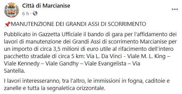 Questo quanto pubblicato sulla pagina fb del Comune di Marcianise: "MANUTENZIONE DEI GRANDI ASSI DI SCORRIMENTO Pubblicato in Gazzetta Ufficiale il bando di gara per l'affidamento dei lavori di manutenzione dei Grandi Assi di scorrimento Marcianise per un importo di circa 3,5 milioni di euro utile al rifacimento dell'intero pacchetto stradale - si legge nella nita - di circa 5 km: Via L. Da Vinci - Viale M. L. King – Viale Kennedy – Viale Gandhy – Viale Evangelista – Via Santella. I lavori interesseranno, tra l'altro, le immissioni in fogna, caditoie e zanelle e tutta la segnaletica orizzontale."