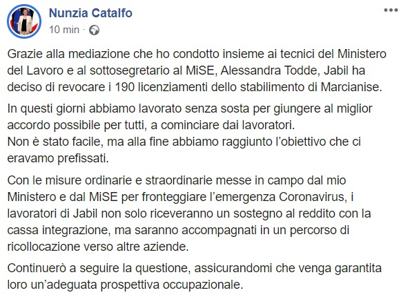 Questo quanto apprendiamo dalla pagina facebook del Min. Catalfo: