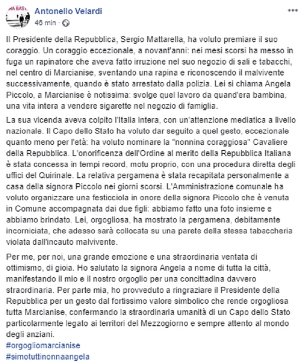 Questo il post pubblicato sulla pagina fb ufficiale del Sindaco di Marcianise Antonello Velardi.