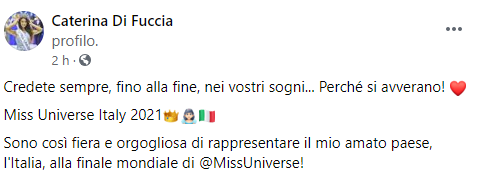 Questo il post pubblicato sulla sua pagina Facebook dalla modella marcianisana Caterina Di Fuccia: "Credete sempre, fino alla fine, nei vostri sogni... Perché si avverano! Miss Universe Italy 2021. Sono così fiera - si legge nel post - e orgogliosa di rappresentare il mio amato paese, l'Italia, alla finale mondiale di MissUniverse".