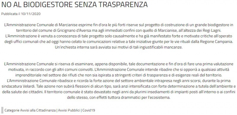 Questo quanto pubblicato sul sito del Comune di Marcianise