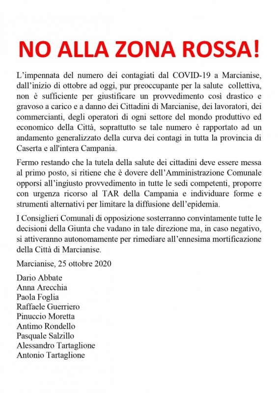 Pubblichiamo il documento dei Consiglieri Comunali di opposizione di Marcianise contro la zona rossa