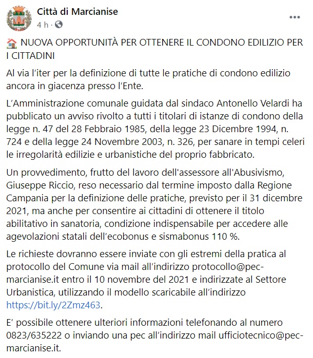 Questo quanto apprendiamo dalla pagina facebook del Comune di Marcianise: