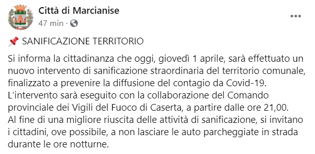 "SANIFICAZIONE TERRITORIO. Si informa la cittadinanza che oggi, giovedì 1 aprile, sarà effettuato un nuovo intervento di sanificazione straordinaria del territorio comunale, finalizzato a prevenire la diffusione del contagio da Covid-19. L’intervento- si legge nella nota- sarà eseguito con la collaborazione del Comando provinciale dei Vigili del Fuoco di Caserta, a partire dalle ore 21,00. Al fine di una migliore riuscita delle attività di sanificazione, si invitano i cittadini, ove possibile, a non lasciare le auto parcheggiate in strada durante le ore notturne."