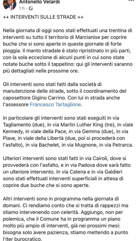 Questo quanto pubblicato sulla pagina fb del Sindaco Velardi