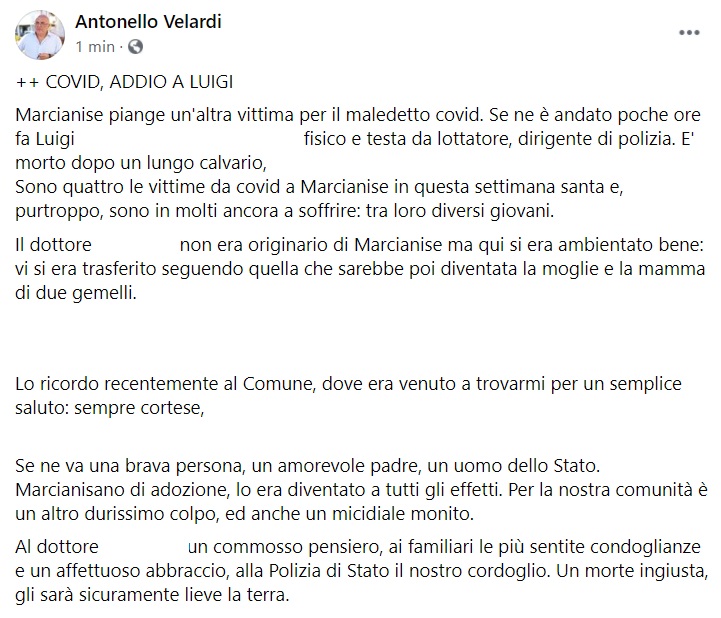 Questo il messaggio di cordoglio del Sindaco Velardi: "COVID, ADDIO A LUIGI ... Marcianise piange un'altra vittima per il maledetto covid. Se ne è andato poche ore fa Luigi ..., fisico e testa da lottatore, dirigente di polizia - si legge nella nota -. E' morto dopo un lungo calvario ... . Sono quattro le vittime da covid a Marcianise in questa settimana santa e, purtroppo, sono in molti ancora a soffrire: tra loro diversi giovani. Il dottore ... non era originario di Marcianise ma qui si era ambientato bene: vi si era trasferito seguendo quella che sarebbe poi diventata la moglie e la mamma di due gemelli. ... . Lo ricordo recentemente al Comune - si legge nella nota -, dove era venuto a trovarmi per un semplice saluto: sempre cortese ... . Se ne va una brava persona, un amorevole padre, un uomo dello Stato. Marcianisano di adozione, lo era diventato a tutti gli effetti. Per la nostra comunità è un altro durissimo colpo, ed anche un micidiale monito. Al dottore ... un commosso pensiero, ai familiari le più sentite condoglianze e un affettuoso abbraccio, alla Polizia di Stato il nostro cordoglio. Una morte ingiusta - si legge nella nota -, gli sarà sicuramente lieve la terra."