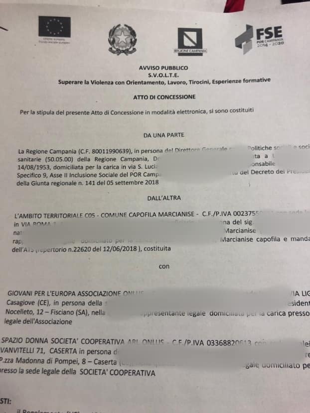 Abbiamo firmato l'atto di concessione della Regione Campania con cui ci viene trasmesso il finanziamento del cosiddetto progetto "Svolte". Si tratta di un progetto a favore delle vittime di violenza, l'importo ammonta a più di 60mila euro. Avevamo partecipato al bando come comune capofila dell'Ambito socio-sanitario e abbiamo potuto farlo (e quindi ottenere il finanziamento) grazie al centro antiviolenza che abbiamo aperto a Marcianise, in via Tagliamento, e di cui gli altri Comuni dell'Ambito avevano votato la chiusura. Ci siamo ostinati a tenerlo aperto con fondi propri comunali e questa decisione ci ha premiato: può perciò partire questo nuovo progetto, di cui peraltro fruiranno tutte le donne non solo di Marcianise ma anche degli altri Comuni dell'Ambito. Quando si dice la concretezza, che rivendichiamo e di cui siamo orgogliosi. Avrei qui da polemizzare ma non lo faccio; evito: faccio parlare i fatti.