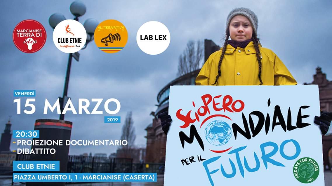 "Il 15 marzo si terrà in tutti il mondo il 'Global Strike For Future', lo sciopero globale contro il riscaldamento del pianeta. La mobilitazione globale nasce con le proteste della giovane attivista svedese Greta Thunberg che sta protestando contro i decisori politici per chiedere misure concrete contro i cambiamenti climatici. Al Club Etnie, piazza Umberto I a Marcianise, dalle 20:30 si terrà la proiezione di un documentario sui cambiamenti climatici, con successivo dibattito."