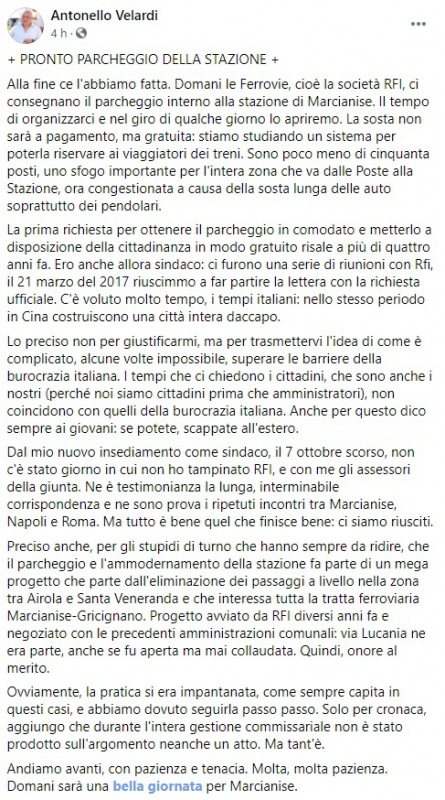 "+ PRONTO PARCHEGGIO DELLA STAZIONE + Alla fine ce l'abbiamo fatta. Domani le Ferrovie, cioè la società RFI, ci consegnano il parcheggio interno alla stazione di Marcianise. Il tempo di organizzarci e nel giro di qualche giorno lo apriremo. La sosta- si legge nella nota- non sarà a pagamento, ma gratuita: stiamo studiando un sistema per poterla riservare ai viaggiatori dei treni. Sono poco meno di cinquanta posti, uno sfogo importante per l'intera zona che va dalle Poste alla Stazione, ora congestionata a causa della sosta lunga delle auto soprattutto dei pendolari. La prima richiesta per ottenere il parcheggio in comodato e metterlo a disposizione della cittadinanza in modo gratuito risale a più di quattro anni fa. Ero anche allora sindaco: ci furono una serie di riunioni con Rfi, il 21 marzo del 2017 riuscimmo a far partire la lettera con la richiesta ufficiale. C'è voluto molto tempo, i tempi italiani: nello stesso periodo in Cina costruiscono una città intera daccapo. Lo preciso non per giustificarmi, ma per trasmettervi l'idea di come è complicato, alcune volte impossibile, superare le barriere della burocrazia italiana. I tempi- si legge nella nota- che ci chiedono i cittadini, che sono anche i nostri (perché noi siamo cittadini prima che amministratori), non coincidono con quelli della burocrazia italiana. Anche per questo dico sempre ai giovani: se potete, scappate all'estero. Dal mio nuovo insediamento come sindaco, il 7 ottobre scorso, non c'è stato giorno in cui non ho tampinato RFI, e con me gli assessori della giunta. Ne è testimonianza la lunga, interminabile corrispondenza e ne sono prova i ripetuti incontri tra Marcianise, Napoli e Roma. Ma tutto è bene quel che finisce bene: ci siamo riusciti. Preciso anche, per gli stupidi di turno che hanno sempre da ridire, che il parcheggio e l'ammodernamento della stazione fa parte di un mega progetto che parte dall'eliminazione dei passaggi a livello nella zona tra Airola e Santa Veneranda e che interessa tutta la tratta ferroviaria Marcianise-Gricignano. Progetto avviato da RFI diversi anni fa e negoziato con le precedenti amministrazioni comunali: via Lucania ne era parte, anche se fu aperta ma mai collaudata. Quindi, onore al merito. Ovviamente, la pratica- si legge nella nota- si era impantanata, come sempre capita in questi casi, e abbiamo dovuto seguirla passo passo. Solo per cronaca, aggiungo che durante l'intera gestione commissariale non è stato prodotto sull'argomento neanche un atto. Ma tant'è. Andiamo avanti, con pazienza e tenacia. Molta, molta pazienza. Domani sarà una bella giornata per Marcianise."