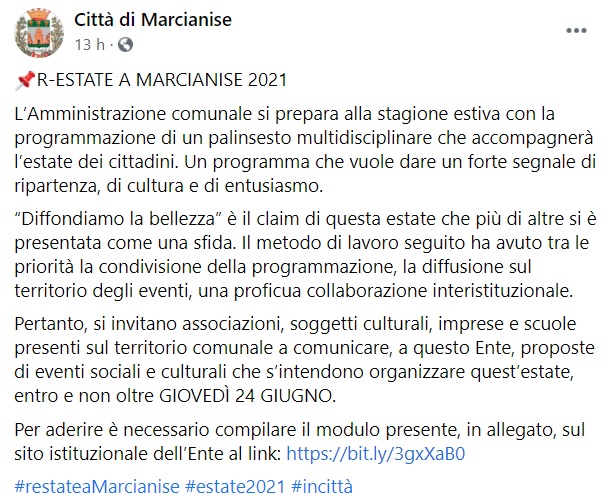"R-ESTATE A MARCIANISE 2021 L’Amministrazione comunale si prepara alla stagione estiva con la programmazione di un palinsesto multidisciplinare che accompagnerà l’estate dei cittadini. Un programma- si legge nella nota- che vuole dare un forte segnale di ripartenza, di cultura e di entusiasmo. “Diffondiamo la bellezza” è il claim di questa estate che più di altre si è presentata come una sfida. Il metodo di lavoro seguito ha avuto tra le priorità la condivisione della programmazione, la diffusione sul territorio degli eventi, una proficua collaborazione interistituzionale. Pertanto, si invitano associazioni, soggetti culturali, imprese e scuole presenti sul territorio comunale a comunicare, a questo Ente, proposte di eventi sociali e culturali che s’intendono organizzare quest’estate, entro e non oltre GIOVEDÌ 24 GIUGNO. Per aderire- si legge nella nota- è necessario compilare il modulo presente, in allegato, sul sito istituzionale dell’Ente al link: https://bit.ly/3gxXaB0"
