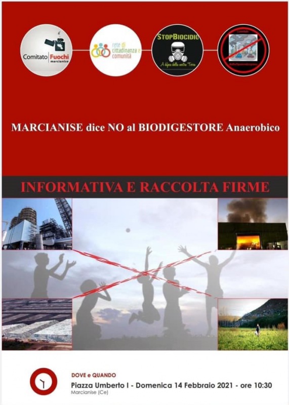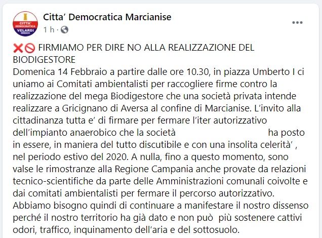 Questo quanto pubblicato sulla pagina fb Città Democratica Marcianise: "FIRMIAMO PER DIRE NO ALLA REALIZZAZIONE DEL BIODIGESTORE Domenica 14 Febbraio a partire dalle ore 10.30, in piazza Umberto I ci uniamo ai Comitati ambientalisti per raccogliere firme contro la realizzazione del mega Biodigestore che una società privata - si legge nella nota - intende realizzare a Gricignano di Aversa al confine di Marcianise. L’invito alla cittadinanza tutta e’ di firmare per fermare l’iter autorizzativo dell’impianto anaerobico che la società ... ha posto in essere, in maniera del tutto discutibile e con una insolita celerità’, nel periodo estivo del 2020. A nulla, fino a questo momento, sono valse le rimostranze alla Regione Campania anche provate da relazioni tecnico-scientifiche da parte delle Amministrazioni comunali coivolte - si legge nella nota - e dai comitati ambientalisti per fermare il percorso autorizzativo. Abbiamo bisogno quindi di continuare a manifestare il nostro dissenso perché il nostro territorio ha già dato e non può più sostenere cattivi odori, traffico, inquinamento dell’aria e del sottosuolo."