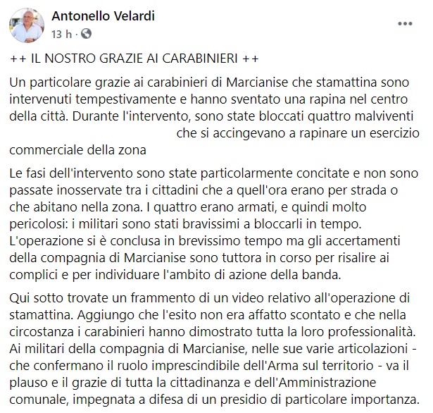 "++ IL NOSTRO GRAZIE AI CARABINIERI ++. Un particolare grazie ai carabinieri di Marcianise che ieri mattina sono intervenuti tempestivamente e hanno sventato una rapina nel centro della città. Durante l'intervento, sono state bloccati- si legge nella nota- quattro malviventi ... che si accingevano a rapinare un esercizio commerciale della zona ... Le fasi dell'intervento sono state particolarmente concitate e non sono passate inosservate tra i cittadini che a quell'ora erano per strada o che abitano nella zona. I quattro erano armati, e quindi molto pericolosi: i militari sono stati bravissimi a bloccarli in tempo. L'operazione si è conclusa in brevissimo tempo ma gli accertamenti della compagnia di Marcianise sono tuttora in corso per risalire ai complici e per individuare l'ambito di azione della banda. Qui sotto trovate un frammento di un video relativo all'operazione di stamattina. Aggiungo che l'esito non era affatto scontato e che nella circostanza i carabinieri hanno dimostrato- si legge nella nota- tutta la loro professionalità. Ai militari della compagnia di Marcianise, nelle sue varie articolazioni - che confermano il ruolo imprescindibile dell'Arma sul territorio - va il plauso e il grazie di tutta la cittadinanza e dell'Amministrazione comunale, impegnata a difesa di un presidio di particolare importanza"