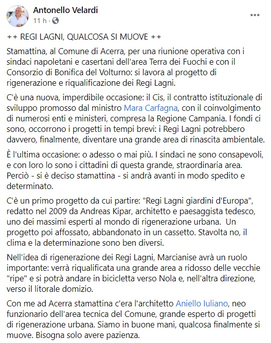 "++ REGI LAGNI, QUALCOSA SI MUOVE ++ Ieri mattina, al Comune di Acerra, per una riunione operativa con i sindaci napoletani e casertani dell'area Terra dei Fuochi e con il Consorzio di Bonifica del Volturno: si lavora al progetto di rigenerazione e riqualificazione dei Regi Lagni. C'è una nuova, imperdibile occasione: il Cis, il contratto istituzionale di sviluppo promosso dal ministro Mara Carfagna, con il coinvolgimento di numerosi enti e ministeri, compresa la Regione Campania. I fondi- si legge nella nota- ci sono, occorrono i progetti in tempi brevi: i Regi Lagni potrebbero davvero, finalmente, diventare una grande area di rinascita ambientale. È l'ultima occasione: o adesso o mai più. I sindaci ne sono consapevoli, e con loro lo sono i cittadini di questa grande, straordinaria area. Perciò - si è deciso stamattina - si andrà avanti in modo spedito e determinato. C'è un primo progetto da cui partire: "Regi Lagni giardini d'Europa", redatto nel 2009 da Andreas Kipar, architetto e paesaggista tedesco, uno dei massimi esperti al mondo di rigenerazione urbana. Un progetto poi affossato, abbandonato in un cassetto. Stavolta no, il clima e la determinazione sono ben diversi. Nell'idea di rigenerazione dei Regi Lagni, Marcianise avrà un ruolo importante: verrà riqualificata una grande area a ridosso delle vecchie "ripe" e si potrà andare in bicicletta- si legge nella nota- verso Nola e, nell'altra direzione, verso il litorale domizio. Con me ad Acerra stamattina c'era l'architetto Aniello Iuliano, neo funzionario dell'area tecnica del Comune, grande esperto di progetti di rigenerazione urbana. Siamo in buone mani, qualcosa finalmente si muove. Bisogna solo avere pazienza."
