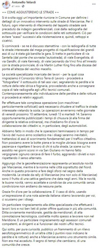 Questo quanto apprendiamo dalla pagina facebook del Sindaco Velardi: