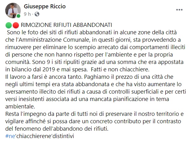 "Sono le foto dei siti di rifiuti abbandonati in alcune zone della città che l’Amministrazione Comunale, in questi giorni, sta provvedendo a rimuovere per eliminare lo scempio arrecato dai comportamenti illeciti di persone che non hanno rispetto per l’ambiente e per la propria comunità. -Si legge nella nota- Sono 9 i siti ripuliti grazie ad una somma che era appostata in bilancio dal 2019 e mai spesa. Fatti e non chiacchiere. Il lavoro a farsi è ancora tanto. Paghiamo il prezzo di una città che negli ultimi tempi era stata abbandonata e che ha visto aumentare lo sversamento illecito dei rifiuti a causa di controlli superficiali e per certi versi inesistenti associata ad una mancata pianificazione in tema ambientale. -Si legge nella nota- Resta l’impegno da parte di tutti noi di preservare il nostro territorio e vigilare affinché si possa dare un concreto contributo per il contrasto del fenomeno dell’abbandono dei rifiuti. #ne’chiacchierene’distintivi"