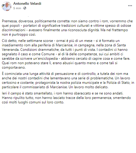 Questo parte del post pubblicato sulla sua pagina Facebook dal Sindaco di Marcianise Antonello Velardi: "(...) Premessa, doverosa, politicamente corretta: non siamo contro i rom, vorremmo che quei popoli - portatori di significative tradizioni culturali e vittime spesso di odiose discriminazioni - avessero finalmente una riconosciuta dignità. Ma nel frattempo - si legge nel post - non è purtroppo così. Ciò detto, nelle settimane scorse - ormai è più di un mese - si è formato un insediamento rom alla periferia di Marcianise, in campagna, nella zona di Santa Veneranda. Condizioni drammatiche, da tutti i punti di vista. I contadini ci hanno segnalato il caso e come Comune - al di là delle competenze - si legge ancora - sui cui ambiti ci sarebbe da scrivere un'enciclopedia - abbiamo cercato di capire cosa e come fare. Quei rom non potevano stare lì, erano abusivi quanto meno e come tali si comportavano. È cominciata una lunga attività di persuasione e di controllo, a tutela dei rom ma anche dei nostri contadini che lamentavano una serie di problematiche. Un lavoro certosino - si legge ancora - e costante, protagonista la nostra polizia municipale e la Polizia di Stato, in particolare il commissariato di Marcianise. Un lavoro molto delicato. Ieri il campo è stato smantellato, i rom hanno sbaraccato e se ne sono andati. Hanno ripulito tutto, non hanno lasciato tracce della loro permanenza, smentendo così - conclude il post - molti luoghi comuni sul loro conto (...)".