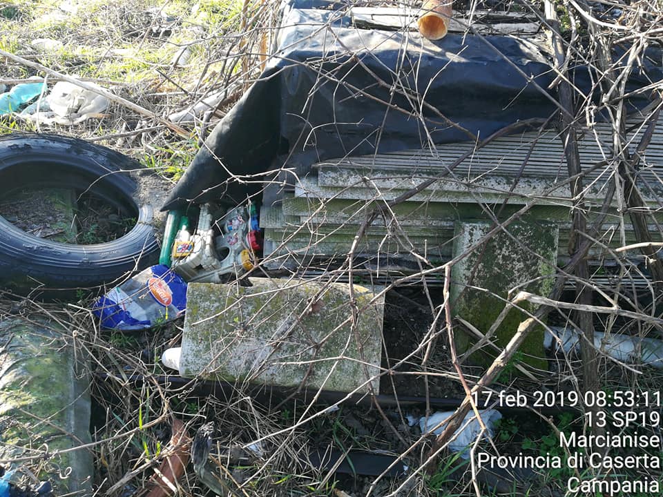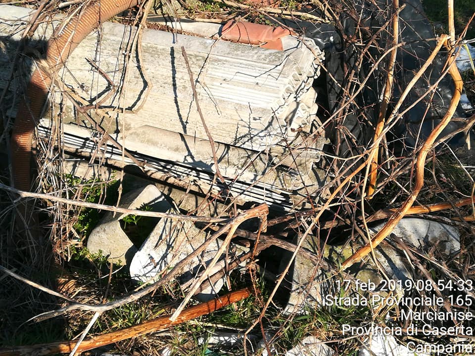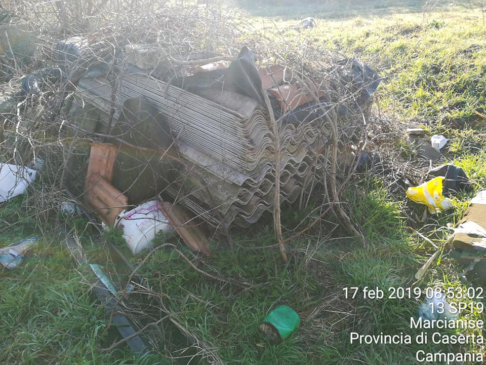 "Marcianise …..ancora la terra dei fuochi ,numerosi materiali in verosimile amianto e rifiuti di ogni genere in parte combusti sparsi ovunque. Nella mattinata di domenica a seguito dell’ennesimo servizio di perlustrazione ambientale effettuato da parte dei volontari D.E.A. unitamente ai volontari NOA predisposto in agro di Marcianise (CE) comune ricadente nel c.d terra dei fuochi, all’interno di un terreno molto probabilmente di proprietà privata, veniva accertata la presenza di una pile di lastre ondulate in verosimile amianto (all’incirca 130/140 mq) parzialmente occultate ,in alcuni casi il materiale ivi presente era rotto in diversi punti e sparso sul terreno,inoltre su un altra area già nota da anni adibita a smaltimento e abbandono di rifiuti si accertava un diffuso fenomeno di abbandono e combustioni ripetute di diverse tipologie di rifiuti pericolosi e non pericolosi,tra cui; un serbatoio per la raccolta dell’acqua in matrice cementizia in verosimile amianto, PFU, innumerevoli materiali plastici,cumuli di RSU e di consumo,materassi,tetti di copertura in materiale plastico,guaine bituminose,diversi bidoni di vernici e pitture murali e altri materiali non ben caratterizzati. Su un’altra area adiacente ...anch’essa ben nota a chiunque, poiché da anni e adibita a consumazione prolungata .Qui si accertava la presenza di un cumulo di materiali di vario genere,a vista si intravedevano 3 cisterne realizzate in materiale plastico ,materassi,diverse lattine di olii esausti,e innumerevoli sacchi neri assimilabili agli RSU,tutti materiali di facile innesco alle combustioni. Oltreciò sotto i piloni della superstrada veniva riscontrata la presenza di innumerevoli materiali pericolosi e non,perlopiù figuravano;cumuli di guaine bituminose,mobilio,materassi,gommapiuma,materiali plastici di ogni genere,..., numerose lastre di copertura in verosimile amianto rotte e sparse ovunque,scarti di materiali edili, indumenti e scarpe, vetro,ferrosi, cumuli di fili elettrici sguainati e privati del rame contenuto, e altri materiali eterogenei".