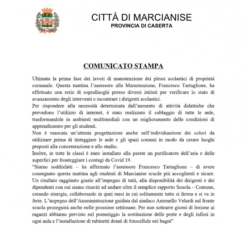 "Ultimata la prima fase dei lavori di manutenzione dei plessi scolastici di proprietà comunale. Questa mattina l’assessore alla Manutenzione, Francesco Tartaglione, ha effettuato una serie di sopralluoghi presso diversi istituti per verificare lo stato di avanzamento degli interventi e incontrare- si legge nella nota- i dirigenti scolastici. Per rispondere alla necessità determinata dall’aumento di attività didattiche che prevedono l’utilizzo di internet, è stato realizzato il cablaggio di tutte le aule, trasformandole in ambienti multimediali con un miglioramento delle condizioni di apprendimento per gli studenti. Non è mancata un’attenta progettazione anche nell’individuazione dei colori da utilizzare prima di tinteggiare le aule e gli spazi comuni in modo da creare luoghi preposti alla concentrazione e allo studio. Inoltre, in tutte le classi è stato installato alla parete un purificatore dell’aria e delle superfici per fronteggiare i contagi da Covid 19. “Siamo soddisfatti – ha affermato l’assessore Francesco Tartaglione – di avere consegnato questa mattina agli studenti di Marcianise scuole più accoglienti e sicure. Un risultato raggiunto grazie all’impegno di tutti, alla disponibilità dei dirigenti e dei dipendenti con cui siamo riusciti ad andare oltre il semplice rapporto Scuola – Comune, creando sinergia, collaborando in quei mesi in cui solitamente tutto si ferma e si va in ferie. L’impegno dell’Amministrazione guidata dal sindaco Antonello Velardi sul fronte scuola proseguirà- si legge nella nota- anche nelle prossime settimane. Per non sottrarre giorni di lezione ai ragazzi abbiamo previsto nel pomeriggio la sostituzione delle porte e degli infissi in ogni aula e l’installazione di rubinetti dotati di fotocellule nei bagni”"