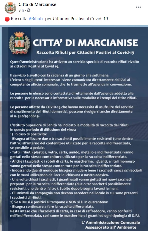Questo quanto pubblicato sulla pagina facebook del Comune di Marcianise: