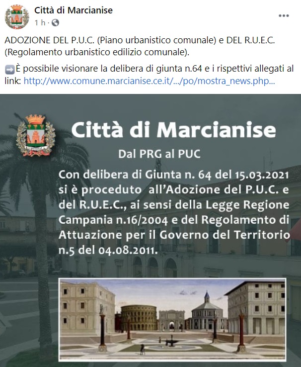"ADOZIONE DEL P.U.C. (Piano urbanistico comunale) e DEL R.U.E.C. (Regolamento urbanistico edilizio comunale). È possibile- si legge nella nota- visionare la delibera di giunta n.64 e i rispettivi allegati al link: http://www.comune.marcianise.ce.it/.../po/mostra_news.php..."