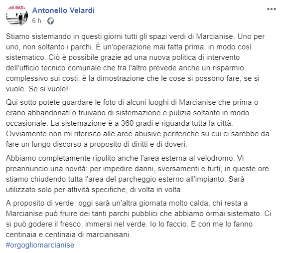 Questo il post pubblicato sulla bacheca Facebook del Sindaco di Marcianise Antonello Velardi: