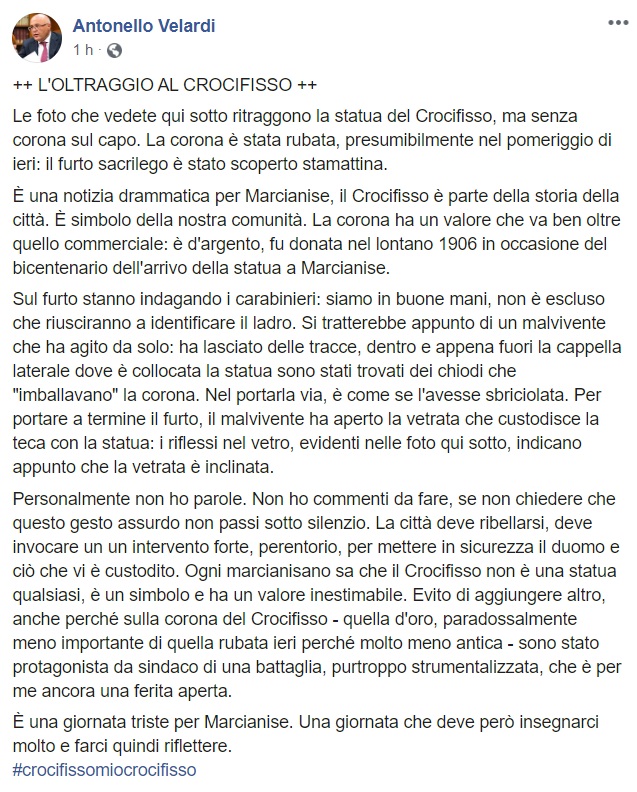 Questo quanto pubblicato sulla pagina facebook di Antonello Velardi: