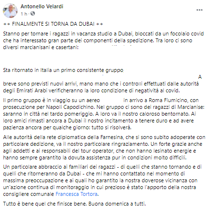 Questo parte del post pubblicato dal Sindaco di Marcianise Antonello Velardi: "Finalmente si torna da Dubai. Stanno per tornare i ragazzi in vacanza studio a Dubai, bloccati da un focolaio covid che ha interessato gran parte dei componenti della spedizione. Tra loro - si legge nel post - ci sono diversi marcianisani e casertani (...). Sta ritornato in Italia un primo consistente gruppo (...) A breve sono previsti nuovi arrivi, mano mano che i controlli effettuati dalle autorità degli Emirati Arabi - si legge ancora - verificheranno la loro condizione di negatività al covid. Il primo gruppo è in viaggio su un aereo (...) in arrivo a Roma Fiumicino, con prosecuzione per Napoli Capodichino. Nel gruppo ci sono dei ragazzi di Marcianise: saranno in città nel tardo pomeriggio. A loro va il nostro caloroso bentornato. Ai loro amici rimasti ancora a Dubai il nostro incitamento - prosegue il post - a tenere duro e ad avere pazienza ancora per qualche giorno: tutto si risolverà. Alle autorità della rete diplomatica della Farnesina, che si sono subito adoperate con particolare dedizione, va il nostro particolare ringraziamento. Un forte grazie anche agli addetti e ai responsabili del tour operator, che non hanno lesinato energie e hanno sempre garantito la dovuta assistenza pur in condizioni molto difficili. Un particolare abbraccio ai familiari dei ragazzi - di quelli che stanno tornando e di quelli che ritorneranno da Dubai - che - si legge ancora nel post - mi hanno contattato nel momento di massima preoccupazione e ai quali ho garantito la nostra doverose vicinanza con un'azione continua di monitoraggio in cui prezioso è stato l'apporto della nostra consigliere comunale Francesca Tortora. Tutto è bene - conclude il post - quel che finisce bene. Buona domenica a tutti".