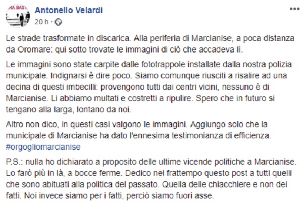 Questo il post e le foto pubblicate sulla pagina fb ufficiale del Sindaco di Marcianise Antonello Velardi