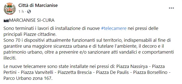 "Sono terminati i lavori di installazione di nuove #telecamere nei pressi delle principali Piazze cittadine. Sono 70 i dispositivi attualmente funzionanti sul territorio, indispensabili al fine di garantire una maggiore sicurezza urbana e di tutelare l’ambiente, il decoro e il patrimonio urbano, oltre a prevenire e/o sanzionare atti vandalici e comportamenti illeciti. -Si legge nella nota- Le nuove telecamere sono state installate nei pressi di: Piazza Nassirya - Piazza Pertini - Piazza Vanvitelli - Piazzetta Brescia - Piazza De Paulis - Piazza Borsellino - Parco Urbano zona 167."