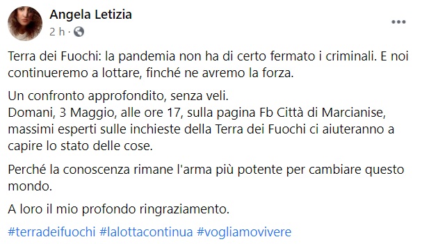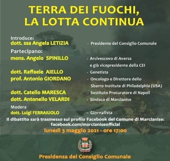 "Terra dei Fuochi: la pandemia non ha di certo fermato i criminali. E noi continueremo a lottare, finché ne avremo la forza. Un confronto approfondito, senza veli. Domani, 3 Maggio, alle ore 17, sulla pagina Fb Città di Marcianise, massimi esperti- si legge nella nota- sulle inchieste della Terra dei Fuochi ci aiuteranno a capire lo stato delle cose. Perché la conoscenza rimane l'arma più potente per cambiare questo mondo. A loro il mio profondo ringraziamento."
