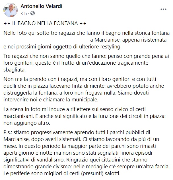 "++ IL BAGNO NELLA FONTANA ++ Nelle foto qui sotto tre ragazzi che fanno il bagno nella storica fontana ... a Marcianise, appena risistemata e nei prossimi giorni oggetto di ulteriore restyling. Tre ragazzi che non sanno quello che fanno: penso con grande pena ai loro genitori, questo- si legge nella nota- è il frutto di un'educazione tragicamente sbagliata. Non me la prendo con i ragazzi, ma con i loro genitori e con tutti quelli che in piazza facevano finta di niente: avrebbero potuto anche distruggerla la fontana, a loro non fregava nulla. Siamo dovuti intervenire noi e chiamare la municipale. La scena in foto mi induce a riflettere sul senso civico di certi marcianisani. E anche sul significato e la funzione dei circoli in piazza: non aggiungo altro. P.s.: stiamo progressivamente aprendo tutti i parchi pubblici di Marcianise, dopo averli sistemati. Ci stiamo lavorando da più di un mese. In questo periodo la maggior parte dei parchi sono rimasti aperti giorno e notte ma non sono stati segnalati finora episodi significativi di vandalismo. Ringrazio quei cittadini che stanno dimostrando grande civismo: nelle medaglie c'è sempre- si legge nella nota- un'altra faccia. Le periferie sono migliori di certi (presunti) salotti."