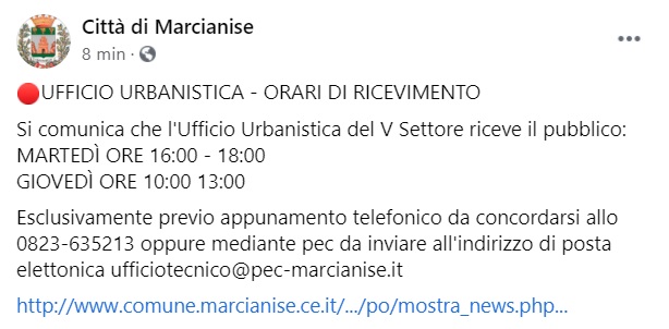 "Si comunica che l'Ufficio Urbanistica del V Settore riceve il pubblico: MARTEDÌ ORE 16:00 - 18:00 GIOVEDÌ ORE 10:00 13:00. -Si legge nella nota- Esclusivamente previo appunamento telefonico da concordarsi allo 0823-635213 oppure mediante pec da inviare all'indirizzo di posta elettonica [email protected]"