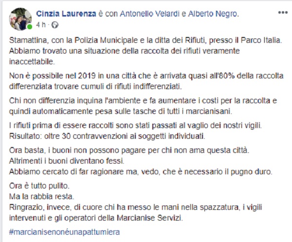 Questo il post pubblcato sulla pagina fb ufficiale dell'Ass. al Comune di Marcianise Cinzia Laurenza.