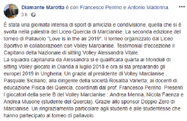 Questo il post pubblicato sulla pagina fb del Preside del Liceo 'Quercia' di Marcianise.