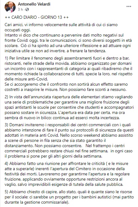Questo quanto pubblicato sulla pagina FB del Sindaco Velardi