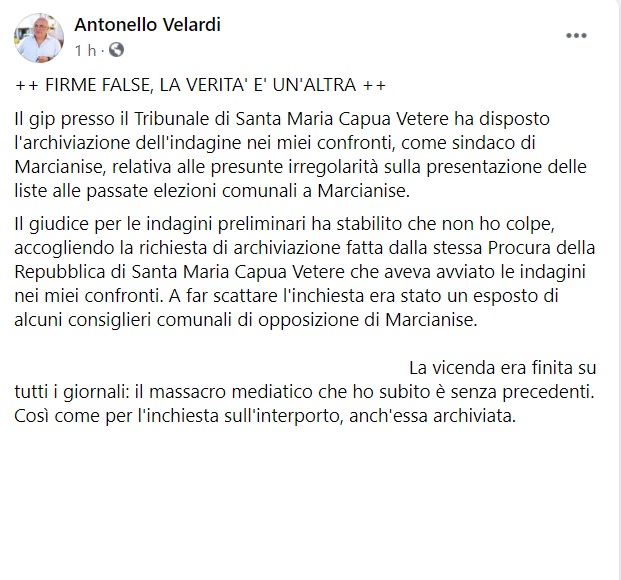 "++ FIRME FALSE, LA VERITA' E' UN'ALTRA ++ Il gip presso il Tribunale di Santa Maria Capua Vetere ha disposto l'archiviazione dell'indagine nei miei confronti, come sindaco di Marcianise, relativa alle presunte irregolarità sulla presentazione delle liste alle passate elezioni comunali a Marcianise. Il giudice per le indagini preliminari- si legge nella nota- ha stabilito che non ho colpe, accogliendo la richiesta di archiviazione fatta dalla stessa Procura della Repubblica di Santa Maria Capua Vetere che aveva avviato le indagini nei miei confronti. A far scattare l'inchiesta era stato un esposto di alcuni consiglieri comunali di opposizione di Marcianise. ... La vicenda era finita su tutti i giornali: il massacro mediatico che ho subito è senza precedenti. Così- si legge nella nota- come per l'inchiesta sull'interporto, anch'essa archiviata...."