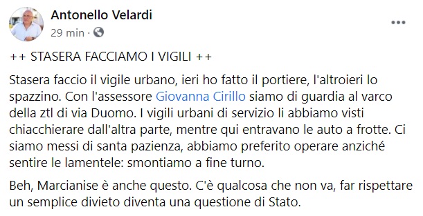 Questo quanto pubblicato sulla pagina fb del Sindaco Velardi: "STASERA FACCIAMO I VIGILI Stasera faccio il vigile urbano, ieri ho fatto il portiere, l'altroieri lo spazzino. Con l'assessore Giovanni Cirillo siamo di guardia al varco della ztl di via Duomo - si legge nella foto -. I vigili urbani di servizio li abbiamo visti chiacchierare dall'altra parte, mentre qui entravano le auto a frotte. Ci siamo messi di santa pazienza, abbiamo preferito operare anziché sentire le lamentele: smontiamo a fine turno. Beh, Marcianise è anche questo. C'è qualcosa che non va, far rispettare un semplice divieto diventa una questione di Stato."