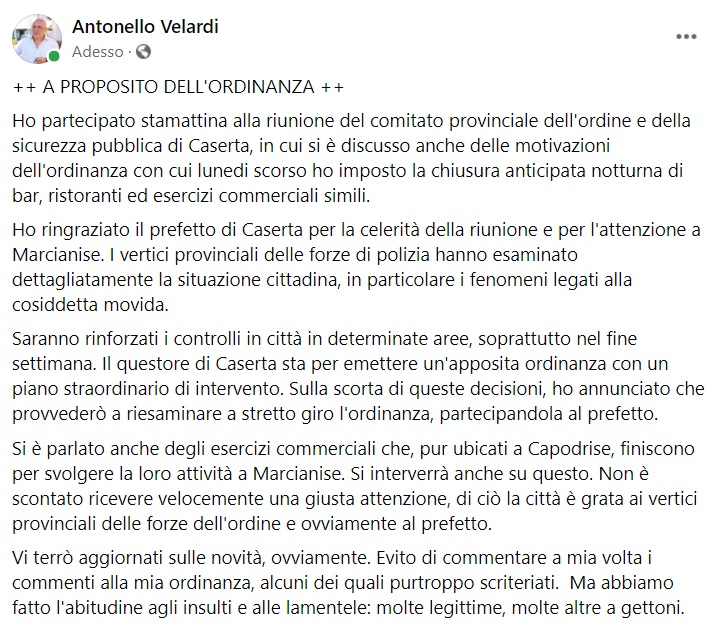 "++ A PROPOSITO DELL'ORDINANZA ++ Ho partecipato stamattina alla riunione del comitato provinciale dell'ordine e della sicurezza pubblica di Caserta, in cui si è discusso anche delle motivazioni dell'ordinanza con cui lunedi scorso ho imposto la chiusura anticipata notturna di bar, ristoranti ed esercizi commerciali simili. Ho ringraziato- si legge nella nota- il prefetto di Caserta per la celerità della riunione e per l'attenzione a Marcianise. I vertici provinciali delle forze di polizia hanno esaminato dettagliatamente la situazione cittadina, in particolare i fenomeni legati alla cosiddetta movida. Saranno rinforzati i controlli in città in determinate aree, soprattutto nel fine settimana. Il questore di Caserta sta per emettere un'apposita ordinanza con un piano straordinario di intervento. Sulla scorta di queste decisioni, ho annunciato che provvederò a riesaminare a stretto giro l'ordinanza, partecipandola al prefetto. Si è parlato anche degli esercizi commerciali che, pur ubicati a Capodrise, finiscono per svolgere la loro attività a Marcianise. Si interverrà anche su questo. Non è scontato ricevere velocemente una giusta attenzione, di ciò la città è grata- si legge nella nota- ai vertici provinciali delle forze dell'ordine e ovviamente al prefetto. Vi terrò aggiornati sulle novità, ovviamente. Evito di commentare a mia volta i commenti alla mia ordinanza, alcuni dei quali purtroppo scriteriati. Ma abbiamo fatto l'abitudine agli insulti e alle lamentele: molte legittime, molte altre a gettoni."