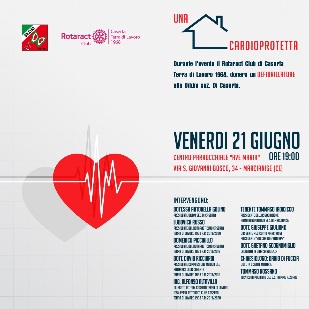 merito alle apparecchiature di defibrillazione. Per permettere tutto questo interverranno rappresentanti di varie associazioni presenti sul territorio locale e - si legge nel comunicato - diversi professionisti del settore: Dott. Antonella Golino (Presidente Uildm Caserta), Ludovica Russo (Presidente Rotaract Club Caserta Terra di lavoro 1968 a.r. 2019/2020), Domenico Piccirillo (Presidente Rotaract Club Caserta Terra di Lavoro 1968 a.r. 2018/2019),