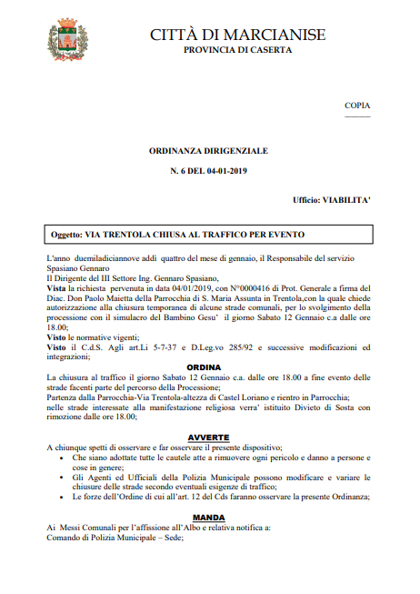 Lo apprendiamo dall'albo pretorio del Comune di Marcianise.