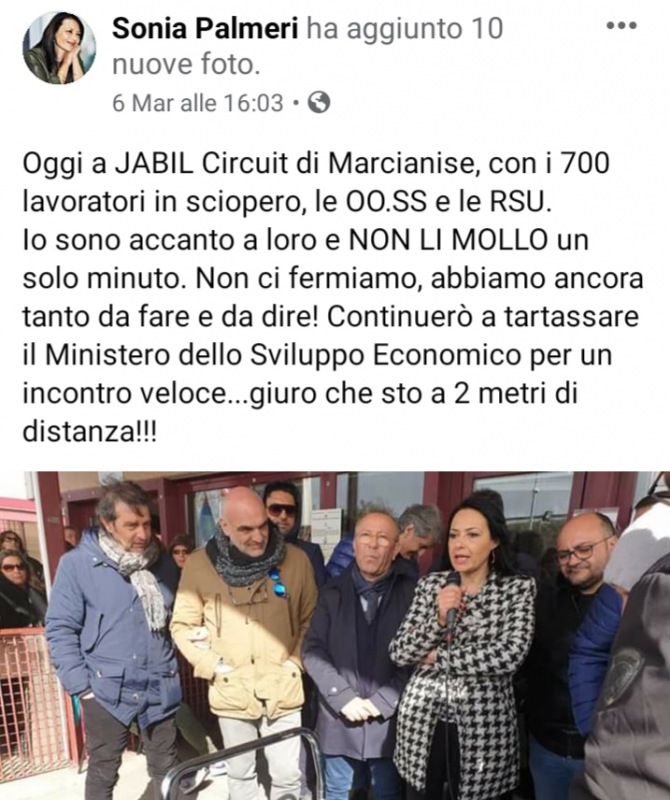 La vicenda Jabil (lo ricordiamo, sono a rischio centinaia di posti di lavoro) ieri pomeriggio ha vissuto un'altra tappa importante. Tantissime le persone presenti all' "...assemblea, alla presenza dell'Assessore regionale Sonia Palmeri. -ci scrivono i dipendenti dell'azienda-. Dopo una settimana di sciopero con presidio fuori ai cancelli dello stabilimento marcianisano ancora nessuna soluzione". Questo, invece, è ciò che ha scritto l'Assessore della Regione Campania sulla propria pagina fb: "Oggi a JABIL Circuit di Marcianise - ha scritto la Palmeri-, con i 700 lavoratori in sciopero, le OO.SS e le RSU. Io sono accanto a loro e NON LI MOLLO un solo minuto. Non ci fermiamo, abbiamo ancora tanto da fare e da dire! Continuerò a tartassare il Ministero dello Sviluppo Economico per un incontro veloce...". "L’Assessore - si legge nella nota inviataci dai dipendenti JABIL- ha poi dichiarato che necessariamente va trovata una strada condivisa tra organizzazioni sindacali, Regione Campania, MISE e aziende interessate con l'obiettivo comune di salvaguardare l'occupazione in provincia di Caserta". Per la FIOM era presente il Segretario FIOM CAMPANIA Massimiliano Guglielmi: "Ci auguriamo -recita il comunicato dei dipendenti Jabil- che già dalle prossime ore possano arrivare dei tavoli di confronto istituzionali che permettano di costruire soluzioni condivise e che impediscano di perdere una delle ultime eccellenze industriali ancora presenti sul territorio".
