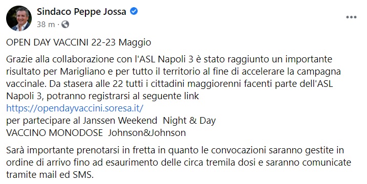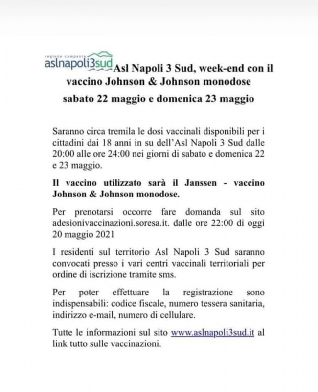 Questo quanto apprendiamo dalla pagina fb del Sindaco Jossa: "OPEN DAY VACCINI 22-23 Maggio Grazie alla collaborazione con l'ASL Napoli 3 è stato raggiunto un importante risultato per Marigliano e per tutto il territorio al fine di accelerare la campagna vaccinale. Da stasera alle 22 tutti i cittadini maggiorenni - si legge nella nota - facenti parte dell'ASL Napoli 3, potranno registrarsi al seguente link CLICCA QUI per partecipare al Janssen Weekend Night & Day VACCINO MONODOSE Johnson&Johnson Sarà importante prenotarsi in fretta in quanto le convocazioni saranno gestite in ordine di arrivo fino ad esaurimento delle circa tremila dosi - si legge nella nota - e saranno comunicate tramite mail ed SMS."