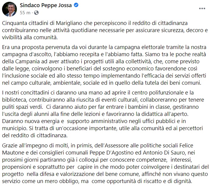 Questo quanto pubblicato sulla pagina fb del Sindaco di marigliano: "Cinquanta cittadini di Marigliano che percepiscono il reddito di cittadinanza contribuiranno nelle attività quotidiane necessarie per assicurare sicurezza, decoro e vivibilità alla comunità. Era una proposta pervenuta da voi durante la campagna elettorale - si legge nella nota - tramite la nostra campagna d'ascolto, l'abbiamo recepita e l'abbiamo fatta. Siamo tra le poche realtà della Campania ad aver attivato i progetti utili alla collettività, che, come previsto dalle legge, coinvolgono i beneficiari del sostegno economico favorendone così l’inclusione sociale ed allo stesso tempo implementando l’efficacia dei servizi offerti nel campo culturale, ambientale, sociale ed in quello della tutela dei beni comuni. I nostri concittadini ci daranno una mano ad aprire il centro polifunzionale e la biblioteca - si legge nella nota -, contribuiranno alla riuscita di eventi culturali, collaboreranno per tenere puliti spazi verdi. Ci daranno aiuto per far entrare i bambini in classe, gestiranno l’uscita degli alunni alla fine delle lezioni e favoriranno la didattica all’aperto. Daranno nuova energia e supporto amministrativo negli uffici pubblici e in municipio. Si tratta di un’occasione importante, utile alla comunità ed ai percettori del reddito di cittadinanza. Grazie all’impegno di molti, in primis, dell’Assessore alle politiche sociali Felice Mautone e dei consiglieri comunali Peppe D’Agostino ed Antonio Di Sauro, nei prossimi giorni partiranno già i colloqui per conoscere competenze, interessi, propensioni e soprattutto per capire in che modo poter coinvolgere i destinatari del progetto - si legge nella nota - nella difesa e valorizzazione del bene comune, affinché non vivano questo servizio come un mero obbligo, ma come opportunità di riscatto e di dignità."