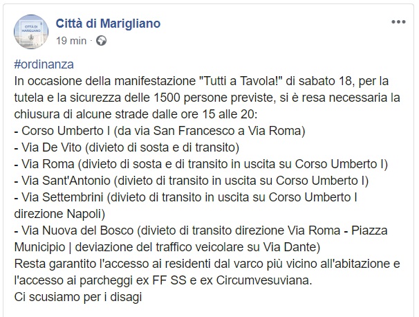 Questo quanto apprendiamo dalla pagina Fb del Comune di Marigliano