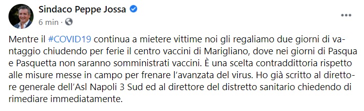 Questo quanto pubblicato sulla pagina fb del Sindaco di Marigliano: "Mentre il COVID19 continua a mietere vittime noi gli regaliamo due giorni di vantaggio chiudendo per ferie il centro vaccini di%u200B Marigliano, dove nei giorni di Pasqua e Pasquetta - si legge nella nota - non saranno somministrati vaccini. È una scelta contraddittoria rispetto alle misure messe in campo per frenare l’avanzata del virus. Ho già scritto al direttore generale dell’Asl Napoli 3 Sud ed al direttore del%u200B distretto sanitario%u200B chiedendo di%u200B rimediare immediatamente."