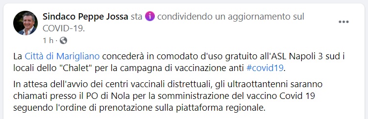 Questo quanto pubblicato sulla pagina fb del Comune di Marigliano: "La Città di Marigliano concederà in comodato d'uso gratuito all'ASL Napoli 3 sud i locali dello "Chalet" per la campagna di vaccinazione anti covid19. In attesa - si legge nella nota - dell'avvio dei centri vaccinali distrettuali, gli ultraottantenni saranno chiamati presso il PO di Nola per la somministrazione del vaccino Covid 19 seguendo l'ordine di prenotazione sulla piattaforma regionale."