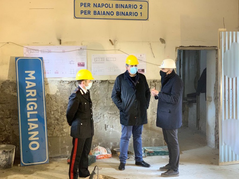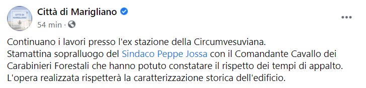 "Continuano i lavori presso l'ex stazione della Circumvesuviana. -Si legge nella nota- Stamattina sopralluogo del Sindaco Peppe Jossa con il Comandante Cavallo dei Carabinieri Forestali che hanno potuto constatare il rispetto dei tempi di appalto. -Si legge nella nota- L'opera realizzata rispetterà la caratterizzazione storica dell'edificio."