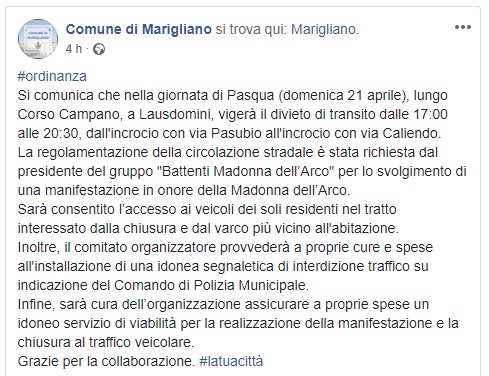 In vista di una manifestazione nel giorno di Pasqua, questa è l'ordinanza del Comune di Marigliano